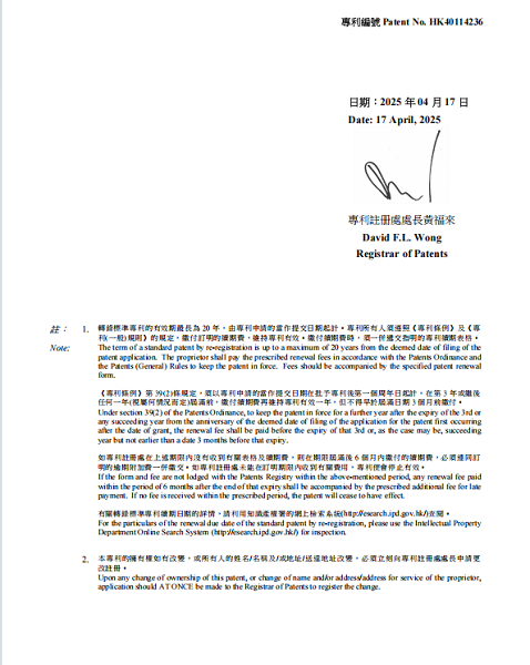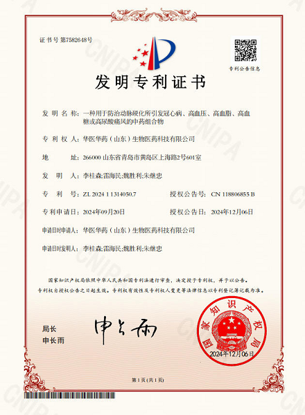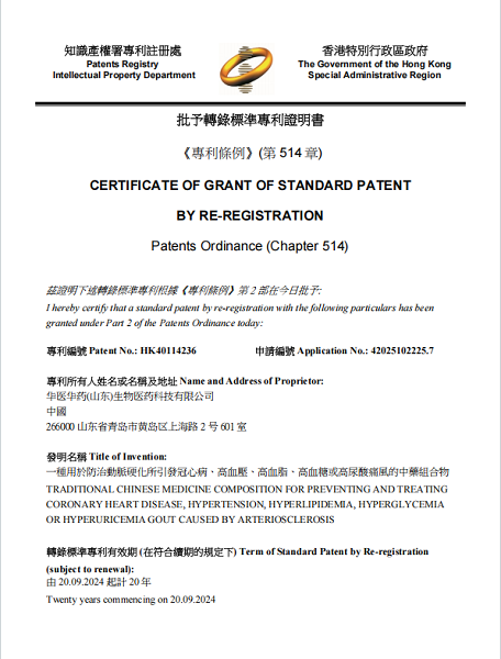 这项专利的发明名称直指核心——“一种用于防治动脉硬化所引发冠心病、高血压、高血脂、高血糖或高尿酸痛风的中药组合物”。专利名称精准地概括了其研发方向:并非仅仅针对某一种单一病症,而是着眼于动脉硬化这一共同的病理基础,旨在从更整体的角度进行干预和防治。此次获得专利注册,标志着该中药组合物的核心技术方案其创新性和实用性获得了官方认可,并将在香港特别行政区受到法律保护。更加难得的是,在此项专利技术荣获香港转录标准专利注册之前,早在2024年12月6日就已经在大陆率先获得了国家专利的权威认可,受到了法律保护。