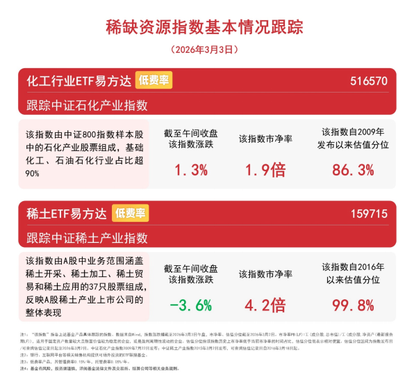截至午间收盘,中证石化产业指数上涨1.3%,中证稀土产业指数下跌3.6%。Wind数据显示,截至昨日,化工行业ETF易方达(516570)近6个交易日连续获资金净流入,合计约1.4亿元。