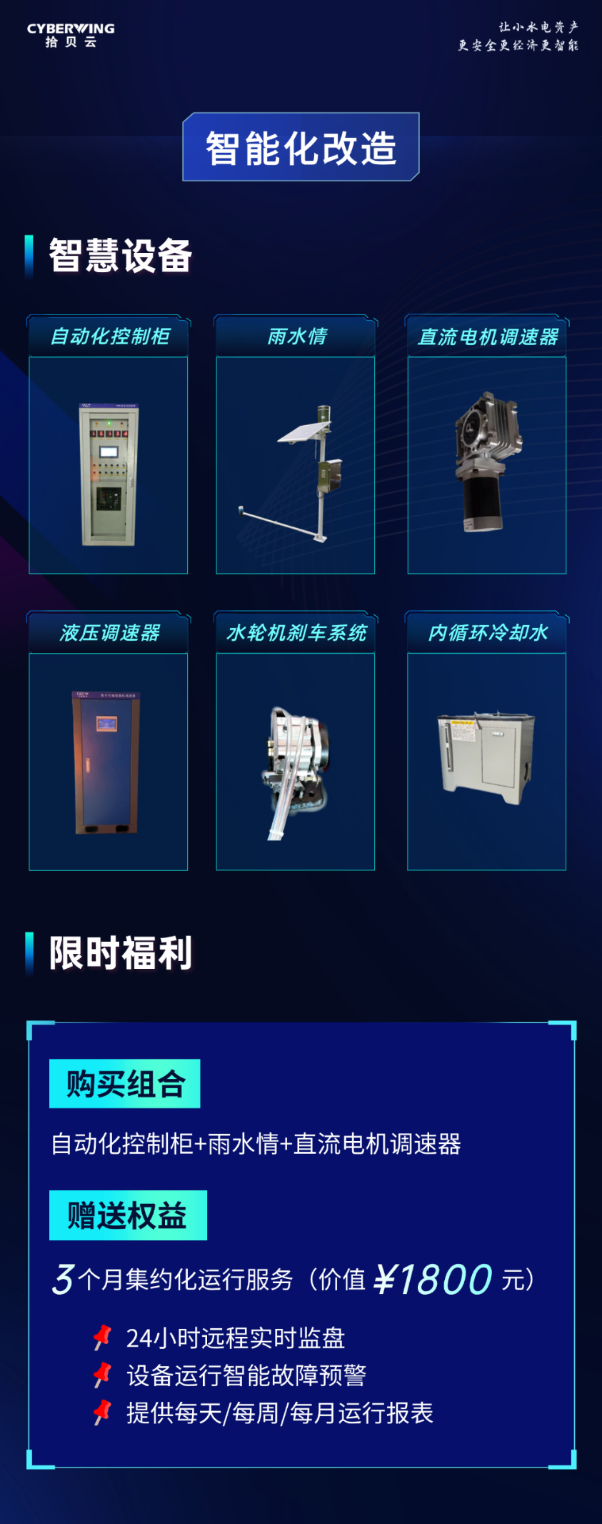 严格落实“系统开展机电设备等设施设备更新改造、推进小水电智能化升级” 等政策要求,拾贝水利水电提供政策适配的自动化控制柜、雨水情、直流电机调速器、液压调速器、水轮机刹车系统、内循环冷却水等核心硬件,即装即用。购买组合装(自动化控制柜+雨水情+直流电机调速器)加赠价值1800元的3个月集约化运行服务,覆盖24小时远程实时监盘、设备运行智能故障预警,提供每日 / 每周 / 每月运行报表,结合小水电核心硬件,可根据降水、来水以及调度要求、生态流量需求,实现自主开停机、蓄放水、负荷动态优化调节、趋势预警等,全面筑牢智能运行基础。