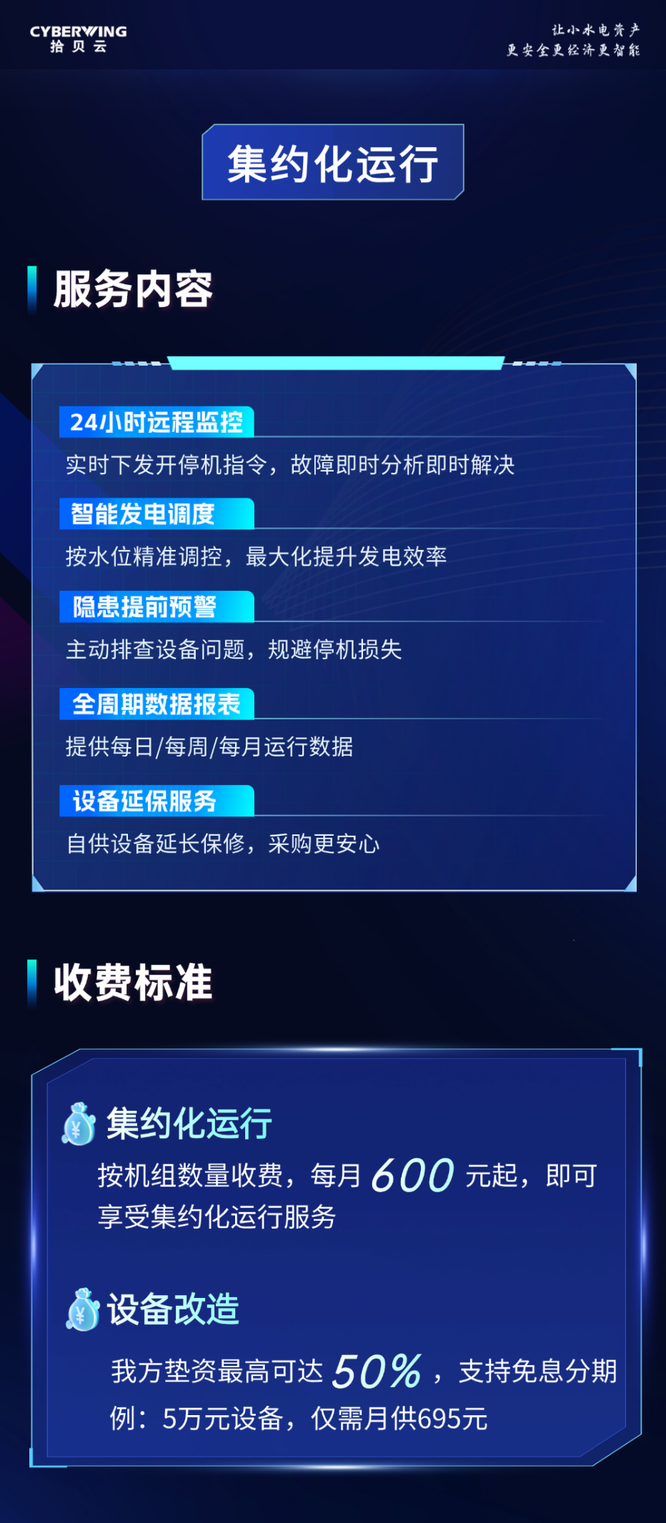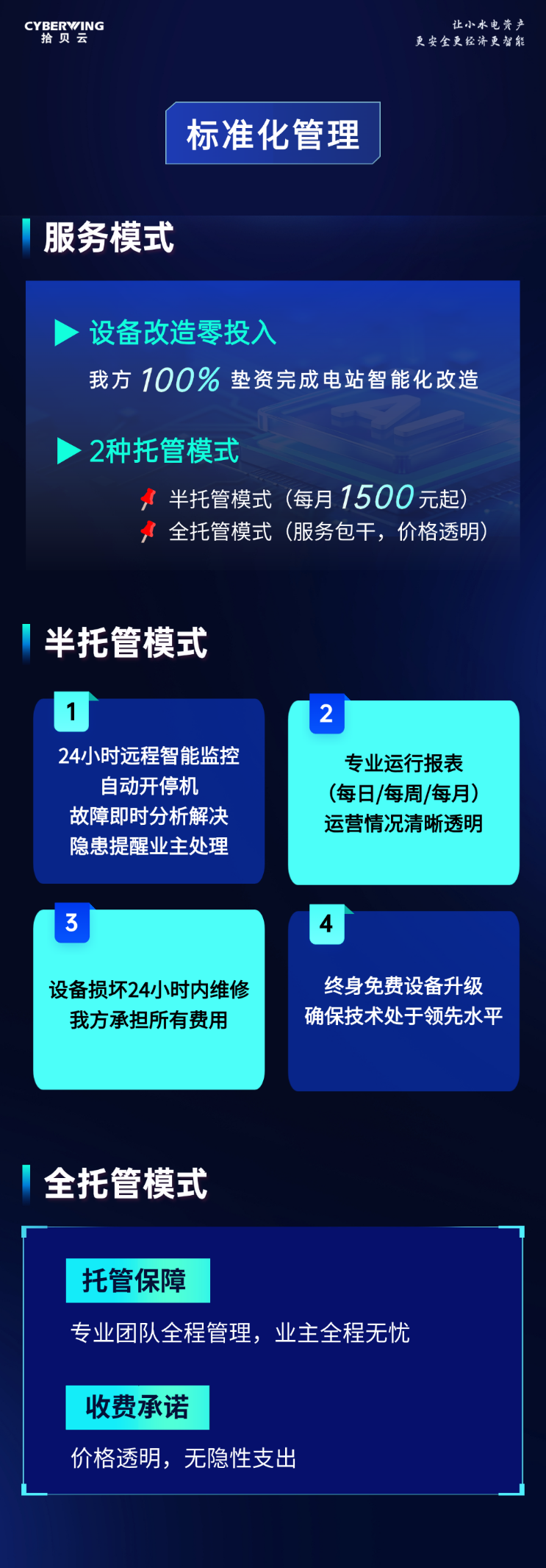 对标“统一流程、技术标准和服务规范,构建与新型电力系统相适配的运维管理新模式”等政策要求,拾贝水利水电以100%全额垫资为核心优势,提供半托管、全托管两种服务模式,实现电站智能化改造零成本、运维管理标准化。