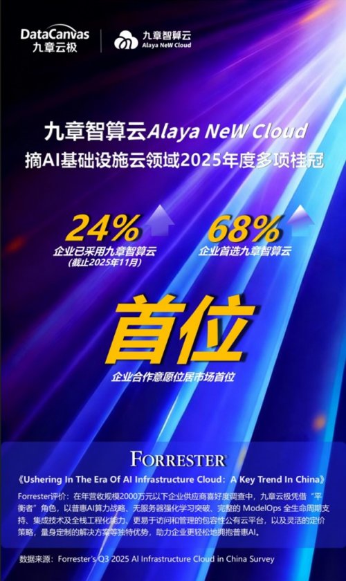 市场认可度的背后,是九章智算云以全栈自研+算力普惠构筑的护城河。在Forrester 2025年基础设施云供应商喜好度评选中,九章智算云平台Alaya New Cloud以68%的占比成为中小企业首选;在已部署智算云的百人规模企业中,其以24%的占比与AWS、Lambda、Azure等国际巨头持平,领跑AI基础设施云赛道。