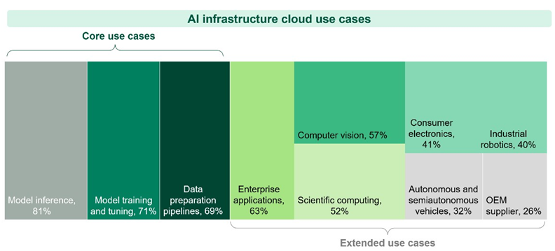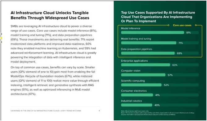 (数据来源:Forrester《Ushering In The Era Of AI Infrastructure Cloud:A Key Trend In China》报告,企业正在实施或计划实施的AI基础设施云支持的顶级应用场景)