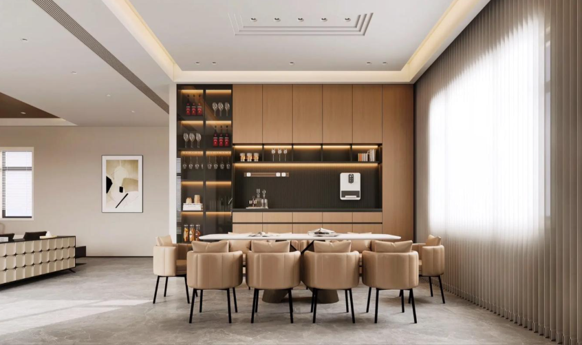 客厅中央,一扇金属镂空屏风巧妙分隔空间,两侧区域风格迥异。一侧奢华璀璨,尽显华贵;一侧质朴天然,木材的纹理清晰可见,散发着质朴的温暖。二者虽被分隔,却又因镂空之处相互交融,和谐共生。餐吧设计独具巧思,纯粹而不失灵动。