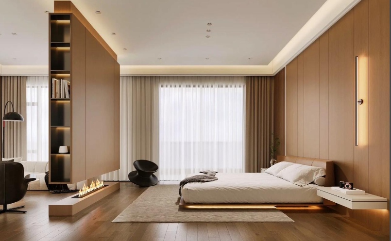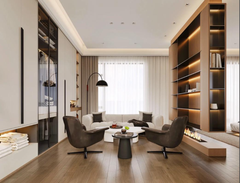 设计师独具慧眼,将金属、皮革、原木有序整合,摒弃简单罗列,赋予设计以灵魂的深度。材质的巧妙重叠,让空间被精细划分,功能分区合理,既满足了生活的私密需求,又彰显出高雅的艺术品位。白色与木色交织,占据空间色彩的主场,如月华与林影共舞。灯带在白色天花板上悠然前行,似时光的轨迹,延伸向无尽的远方,静雅氛围随之弥漫,将宁静与优雅赋予每一个角落。